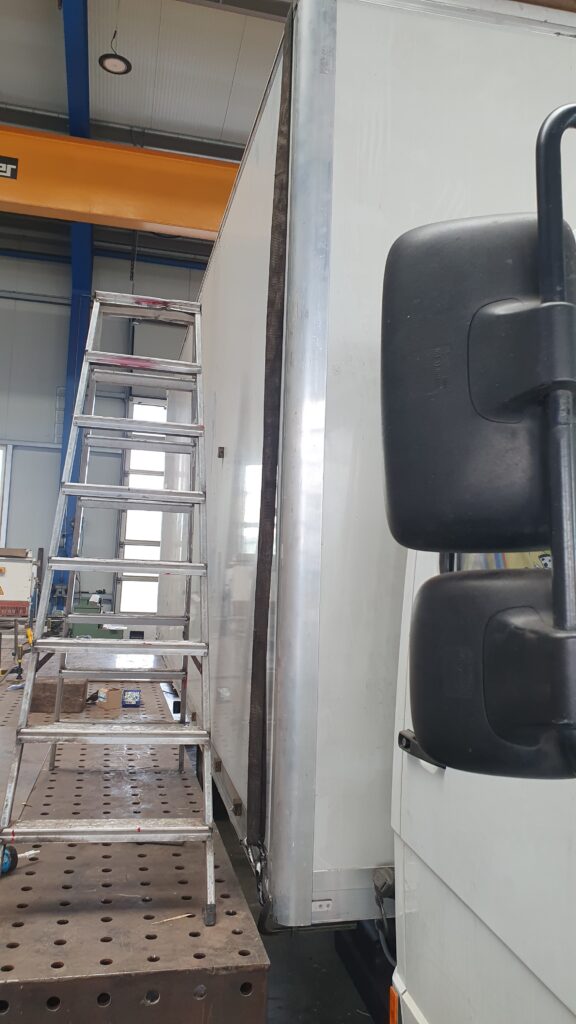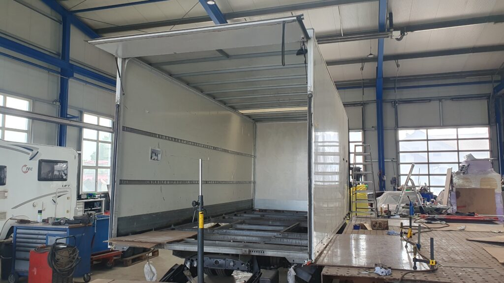 Zunächst musste die Seitenwand abgebaut und durch eine neue ersetzt werden. Ein irrsinniger Aufwand! Alle Schrauben des Zwischenträgers mussten entfernt und durch neue Spezialschrauben ersetzt werden, die schwer zu beschaffen waren (einmal verschraubt, sind sie nicht mehr zu lösen). Und nicht zu vergessen: Das Dach war ebenfalls mit der Seitenwand verbunden. Wie sie das geschafft haben, bleibt ein Rätsel.