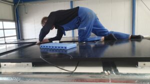 Darauf kam dann eine 12mm HPL-beschichtete Bodenplatte. Wer jetzt denkt: „Oh, das klingt einfach“ – nein. Zuschneiden, einpassen, aufkleben, festdrücken, nochmal nachschneiden, nochmal aufkleben, fluchen, dann doch richtig machen. Und das Ganze FÜNF MAL. Ja, fünf Platten. Fünf Mal das gleiche Spiel. Irgendwann wusste sogar der Staubsauger von alleine, wann der nächste Schritt kommt.